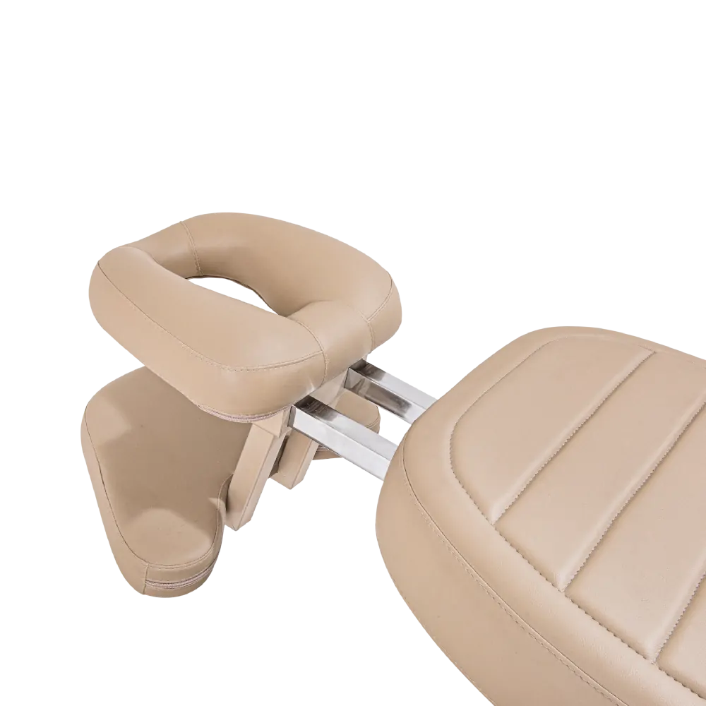 Como a almofada do apoio de cabeça é removível, é possível posicionar o cliente de bruços de maneira ergonômica, além de contar com um apoio de braços que garante o conforto e ainda permite o uso de celular durante o atendimento.